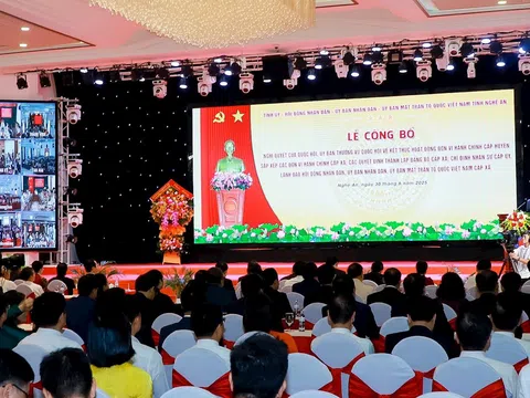 Sáng 30/6, tại TP. Vinh, Tỉnh ủy, HĐND, UBND, Ủy ban MTTQ Việt Nam tỉnh Nghệ An long trọng tổ chức Lễ công bố Nghị quyết của Quốc hội, Ủy ban Thường vụ Quốc hội và các quyết định quan trọng của tỉnh liên quan đến việc kết thúc hoạt động đơn vị hành chính cấp huyện, sắp xếp các đơn vị hành chính cấp xã; thành lập tổ chức đảng, chỉ định nhân sự cấp ủy, lãnh đạo HĐND, UBND và Ủy ban MTTQ Việt Nam cấp xã.