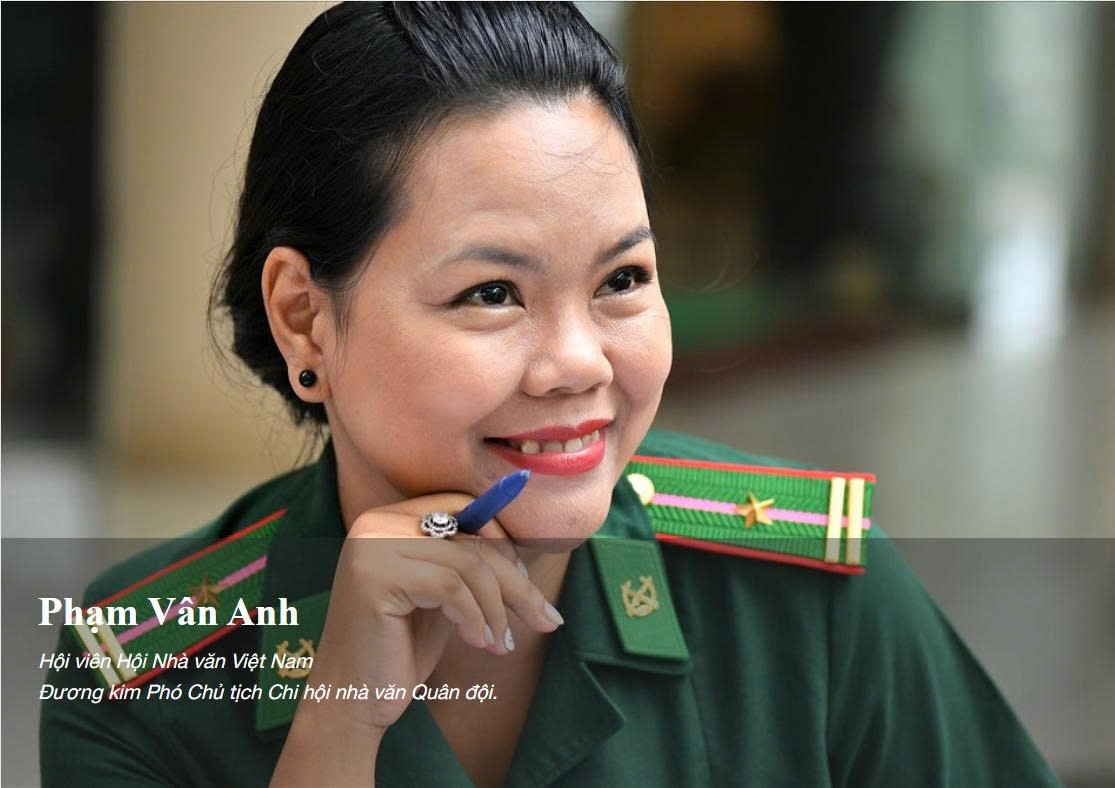 Trung tá, nhà văn Phạm Vân Anh. Sinh ngày: 13/01/1980. Quê quán: Nam Thanh, Nam Trực, Nam Định. Chức vụ: Trung tá - công tác tại Phòng Tuyên huấn, Cục Chính trị, Bộ Tư lệnh Bộ đội Biên phòng, Bộ Quốc phòng. Trình độ chuyên môn: Cử nhân tiếng Anh, Thạc sĩ Quản lý hoạt động Tư tưởng - Văn hóa. Hội viên: Hội Nhà văn Việt Nam, Hội Nhà báo Việt Nam.