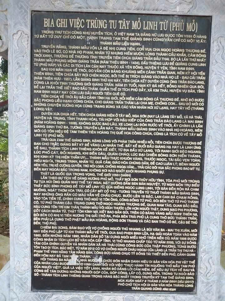 Tạp chí Nghiên cứu và Phát triển (số 1 (135). 2017, tác giả Chu Xuân Giao viết: “Về kết cấu kép ở trung tâm của truyền thuyết hệ thần Liễu Hạnh qua khảo sát thần tích Đệ tam tiên chúa được phụng thờ ở Nga Sơn và Nghĩa Hưng”... Lần theo dấu tích ngôi đền Mẫu ở thôn Thái Tây, gần đến ngày lễ hội (7/3 âm lịch) năm 2025 chúng tôi về thăm di tích Phủ Mỗ tại xã Hà Thái, huyện Hà Trung, tỉnh Thanh Hoá. Tại chính điện Phủ Mỗ có dựng tấm bia ký bằng đá nguyên khối, trán bia trang trí hoa văn cánh sen, riềm bia hoa văn cúc dây cách điệu, nổi bật dòng chữ in hoa tiếng Việt: “BIA GHI VIỆC TRÙNG TU TÂY MỖ LINH TỪ (PHỦ MỖ)” (trên 1000 từ) do tác giả Trần Quang Dũng, Phó Chủ tịch Hội Di sản văn hoá Thăng Long biên soạn, mùa Xuân ngày 8 tháng 3 năm Đinh Dậu (2017).