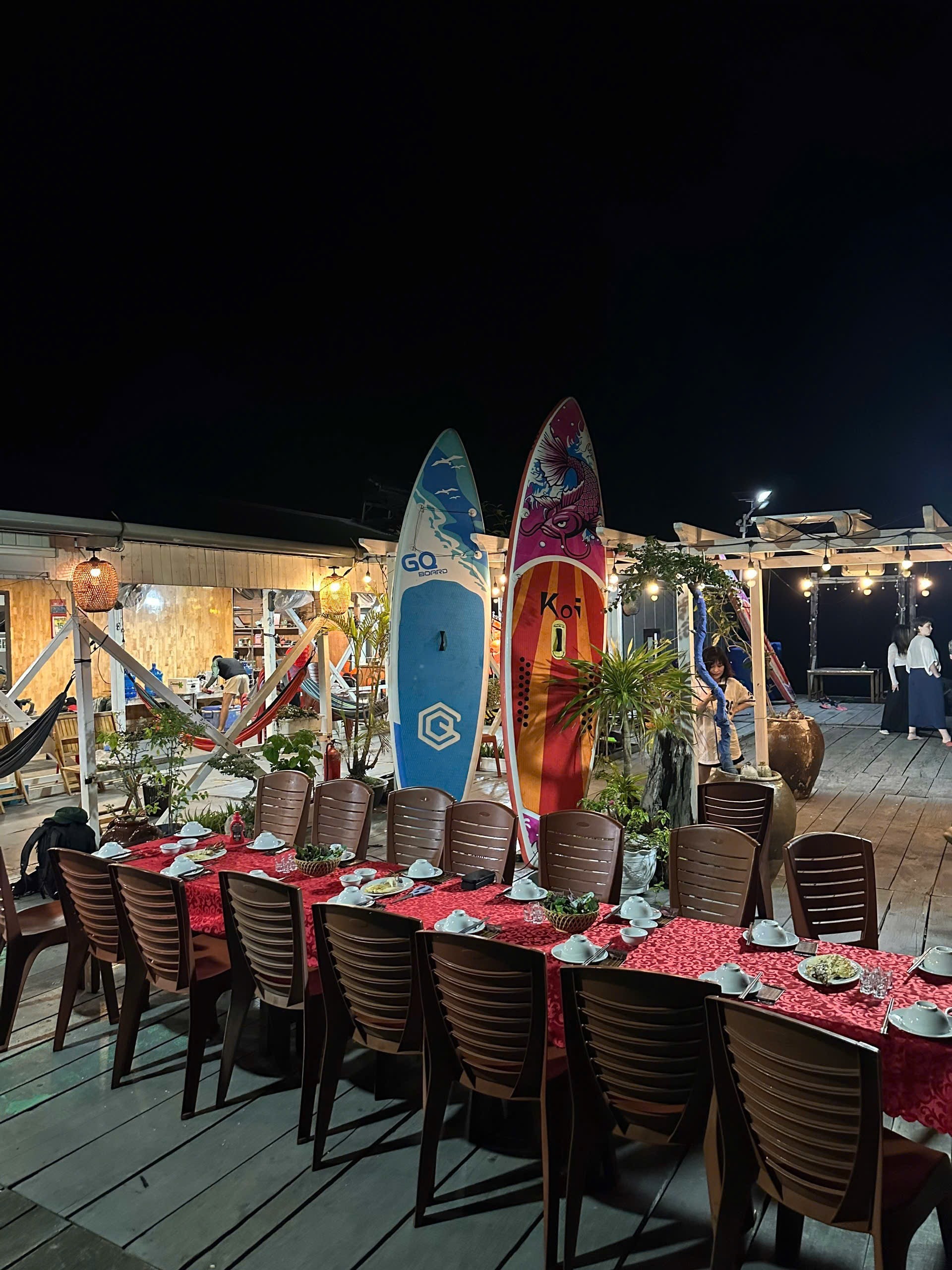 Tối đến, nhóm mình quây quần bên mâm cơm giữa biển, mở nhạc, hát hết mình mà chẳng sợ phiền ai. Giữa khung cảnh đó, mọi phiền muộn như tan ra theo gió.