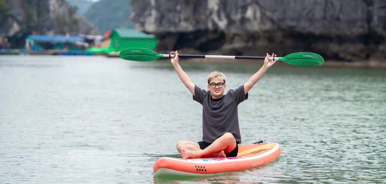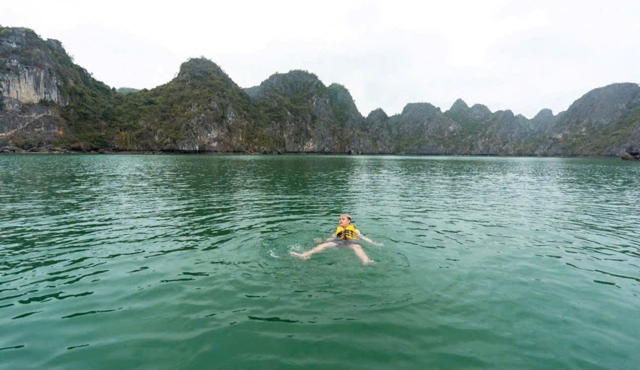 Đi tiếp, mình đến “Tuyệt tình cốc” giữa lòng vịnh. Muốn vào phải vượt qua ba hang đá liền nhau, nước trong xanh đến mức có thể nhìn thấy đáy. Mình đã chèo kayak qua từng khe đá, vùng vẫy bơi lội ở đây, từng ánh nắng xuyên qua rọi xuống mặt nước - yên bình đến khó tin.