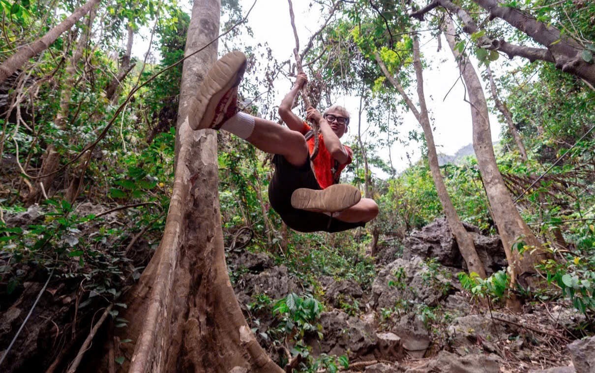 Khung cảnh yên tĩnh, tiếng chim và gió quyện vào nhau tạo nên bản hòa âm tự nhiên không gì sánh được. Thi thoảng có vài tiếng ộp ộp nghe cũng vui tai. Ở một đoạn đường trong rừng, nhóm mình còn chơi trò “Tarzan phiên bản Việt” - đu dây giữa rừng như phim. Phải mất vài cú trượt mới có được một bức ảnh ưng ý, nhưng cả nhóm đều cười như trẻ con - lần cuối cùng bạn cười hết cỡ vì một trò chơi là khi nào?