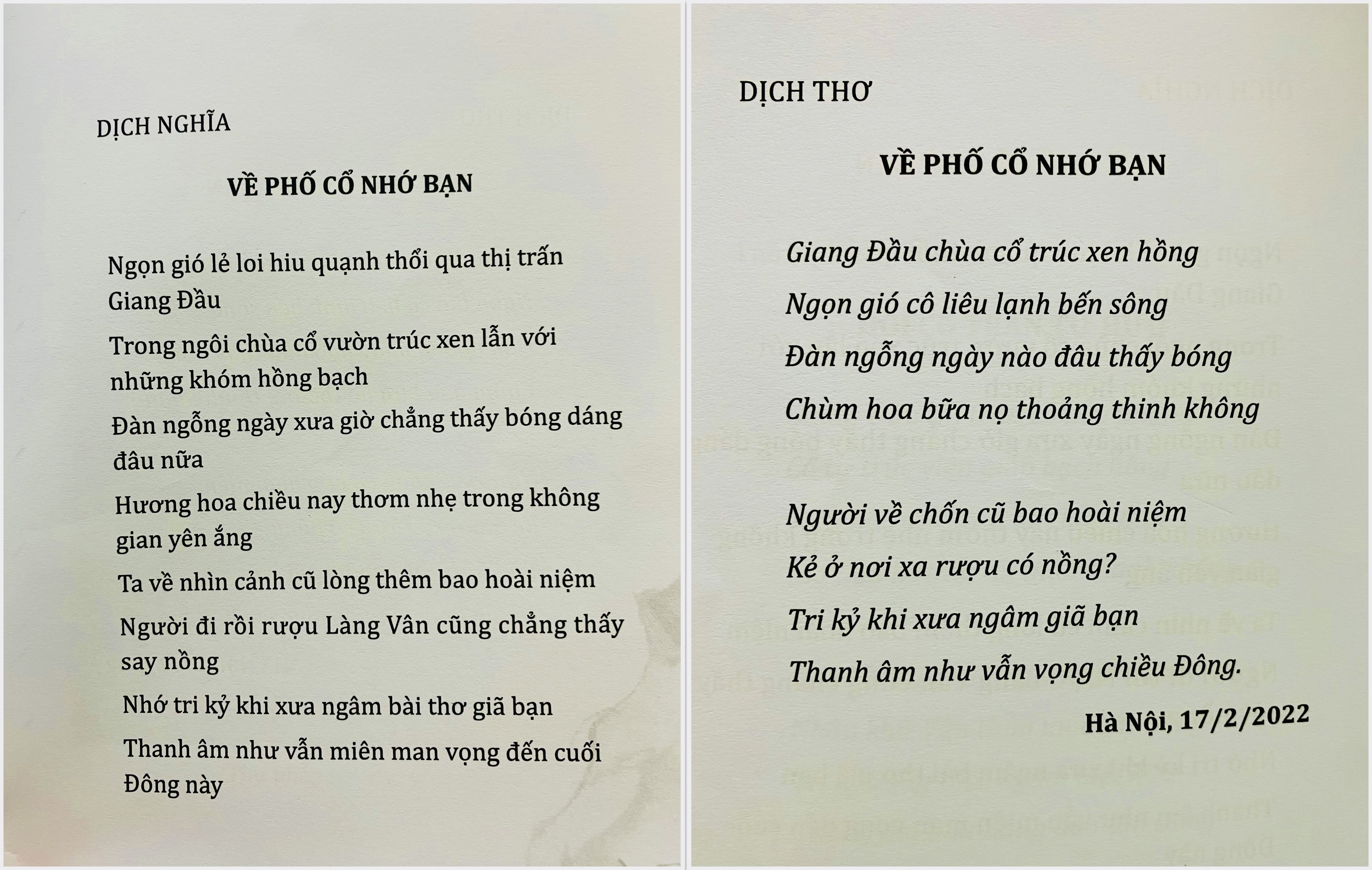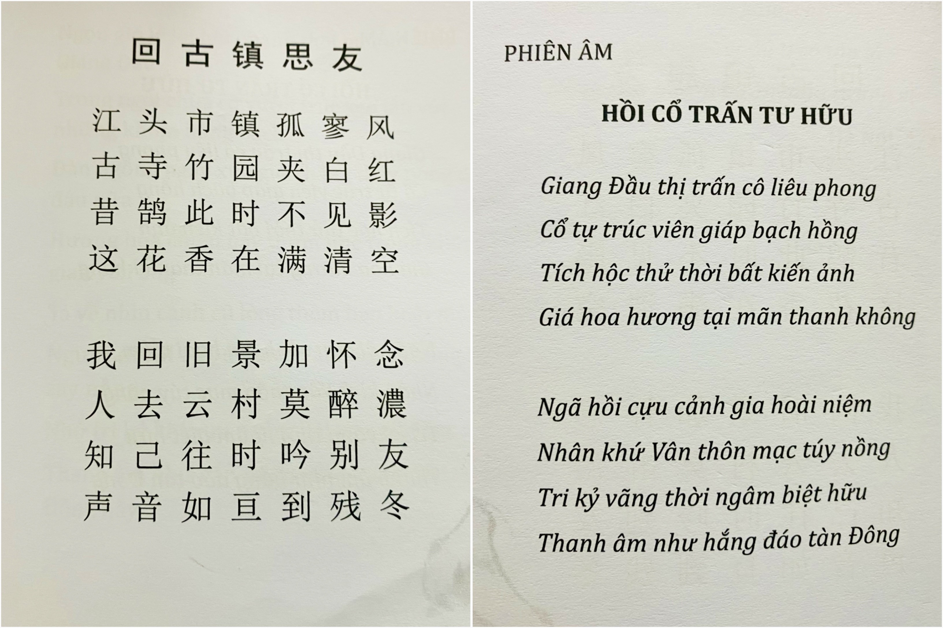 Dưới đây là bài thơ “Hồi cổ trấn tư hữu - Về phố cổ nhớ bạn”, gồm 4 phần: Hán ngữ, phiên âm, dịch nghĩa và dịch thơ.