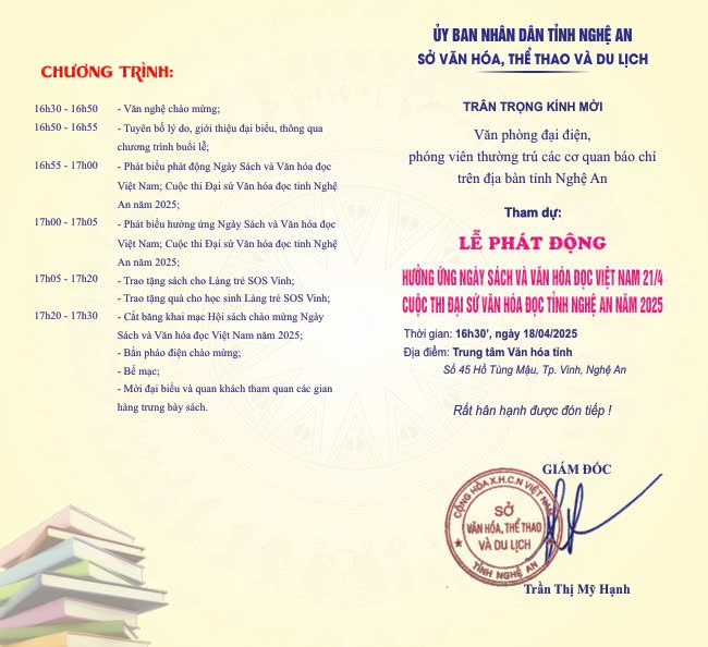 Thực hiện Kế hoạch số 726/KH-BVHTTDL ngày 21/3/2025 của Bộ Văn hóa, Thể thao và Du lịch và Công văn số 2658/UBND-VX ngày 04/4/2025 của UBND tỉnh Nghệ An, Sở Văn hóa và Thể thao Nghệ An phối hợp với UBND thành phố Vinh cùng các đơn vị xuất bản, phát hành trong và ngoài tỉnh tổ chức Lễ phát động Ngày Sách và Văn hóa đọc Việt Nam, Cuộc thi Đại sứ Văn hóa đọc tỉnh Nghệ An năm 2025, cùng nhiều hoạt động bên lề sôi nổi.